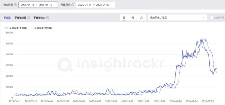 从下载曲线来看,Genspark在2026年1月中下旬开始进入一轮明显增长阶段,并在3月15日达到单日超过5.5万次的下载峰值。尽管此后有所回落,但整体仍维持在高于年初的水平。