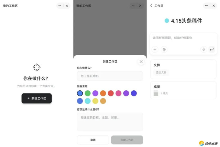 内容生产上,Genspark已覆盖AI视频、AI设计、AI剪辑、AI播客等多种工具模块。从单个功能来看,这些能力较为分散,但当“云盘负责存储、AI负责生成、用户负责输入意图”三者被串联后,一个较完整的工作流开始形成。应用内还设有专门的工作区板块,用户可自行命名、设定目标、主体与背景,在专属工作区中对话智能体执行任务、上传云盘文件、邀请成员协作等。