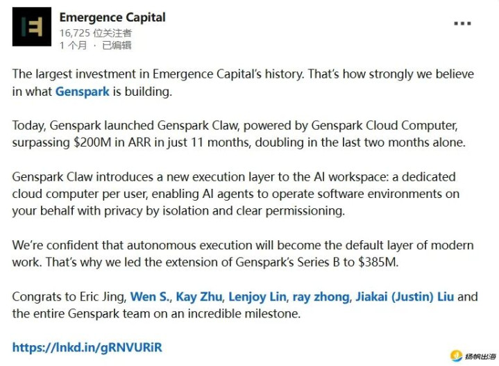 前不久,其投资方EmergenceCapital在LinkedIn公开发文称,Genspark的年化收入运行率在约11个月内突破2亿美元。在当下AI应用赛道里,这样的增长速度依然属于第一梯队。不过需要注意的是,年化收入运行率更多是基于当前收入节奏的年化推算,并不等同于企业已经实际入账的收入规模。