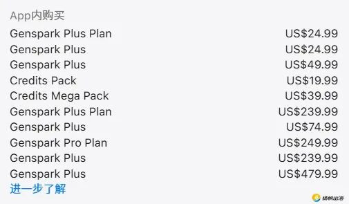 Genspark内购项目及价格。图源:AppStore